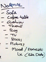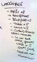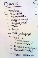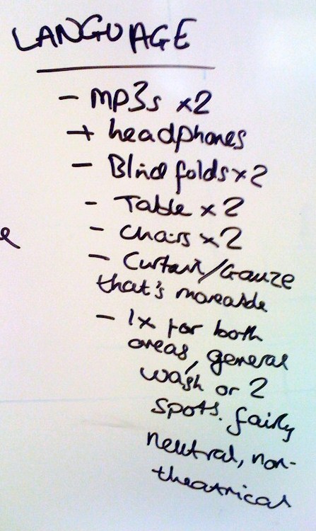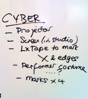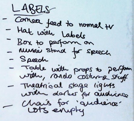 This is the first set of lists we made for figuring out what we would need for each of the squares. We felt it was important to keep our minds open to the fact that these could all change and that these lists didn't mean everything was set in stone. However, it was also important that we started thinking about the practical side of the performance and collect our thoughts about what we would need to gather or make for the project. Click on any of the images to enlarge them.